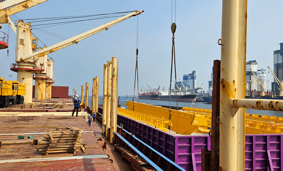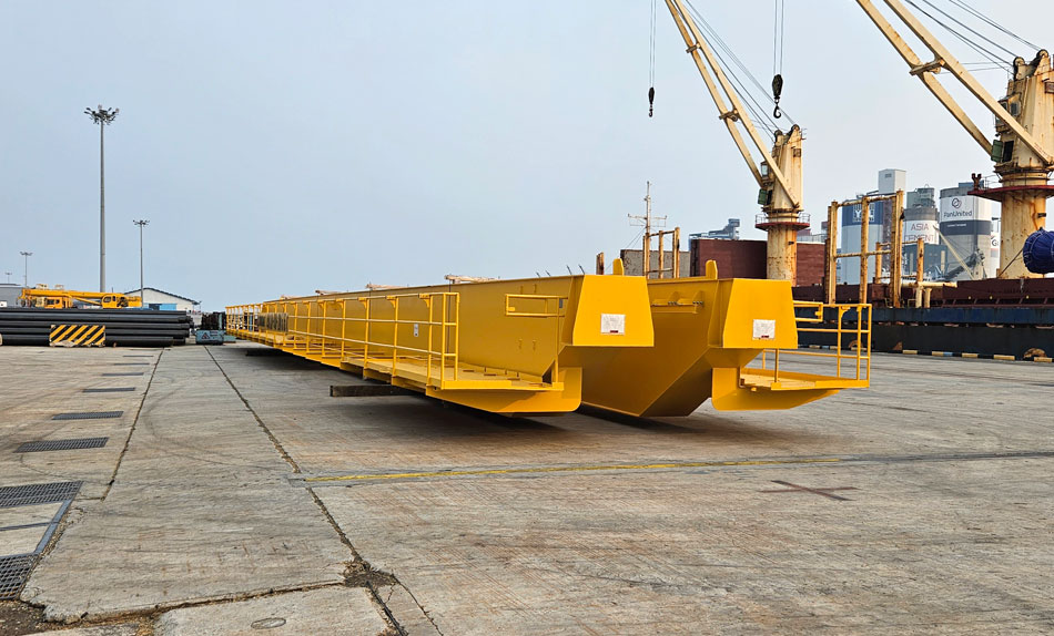 The first challenge faced for this project was during the cargo assessment stage. The main girders were overlength at 35.5 meters long, with irregular top surfaces. Any logistics movement of these main girders would require tandem lifting using suitable crane equipment i.e. when a load is lifted using 2 devices simultaneously.