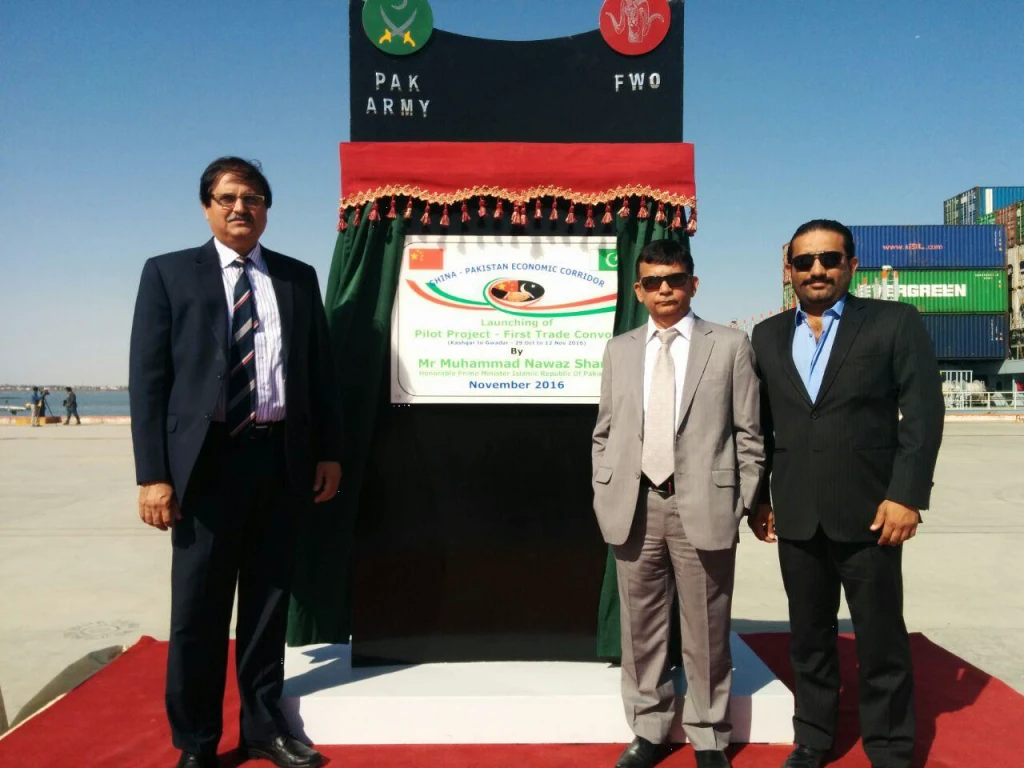 On 29th October 2016 the trade convoy of 95 containers departed from Kashgar (Western China) and entered on 30th Oct into Pakistan at Kunjerb pass. The convoy arrived at Gwadar port on 12th November via Western route. Another convoy of 66 containers from Lahore (Pakistan) arrived at Gwadar port via eastern route. The Chinese origin containers were loaded on Chinese vessel name Cosco Wellington and Pakistan origin containers were loaded on Pakistani vessel name Al Hussein. The containers were loaded on the ships destiny for the Middle East and Africa from Gwadar port.