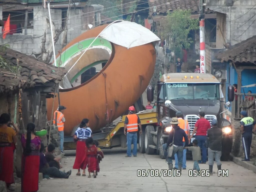 The highlight of this transport was the very difficult road conditions. SAC Internacional designed a special package with a steel base with exactly the dimensions and position to be able to cross a town. As you can see from the pictures, the position of the piece allows them to pass some narrow places, the lower side of the piece cross town below the roofs, and the higher over the roofs.